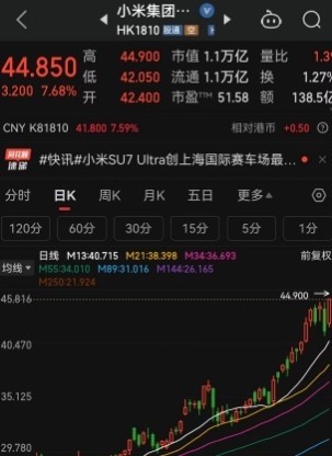 值得注意的是,在今日比亚迪出大涨的同时,小米集团也不甘寂寞。今日盘中,小米集团大涨超过7%,一度涨至44.35元/股,再创历史新高,目前总市值约1.05万亿元(1.12万亿港元)。