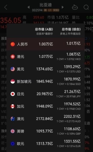 14日盘中,比亚迪A股股价创出历史新高,一度冲至359.6元/股历史高点,大涨超过5%,自2月5开年以来,比亚迪A股涨幅超过30%。在股价连番大涨之下,比亚迪市值时隔两年半之后重回万亿大关,截止A股收盘比亚迪报356.05元/股,目前总市值约1.01万亿元(1.08万亿港元)。